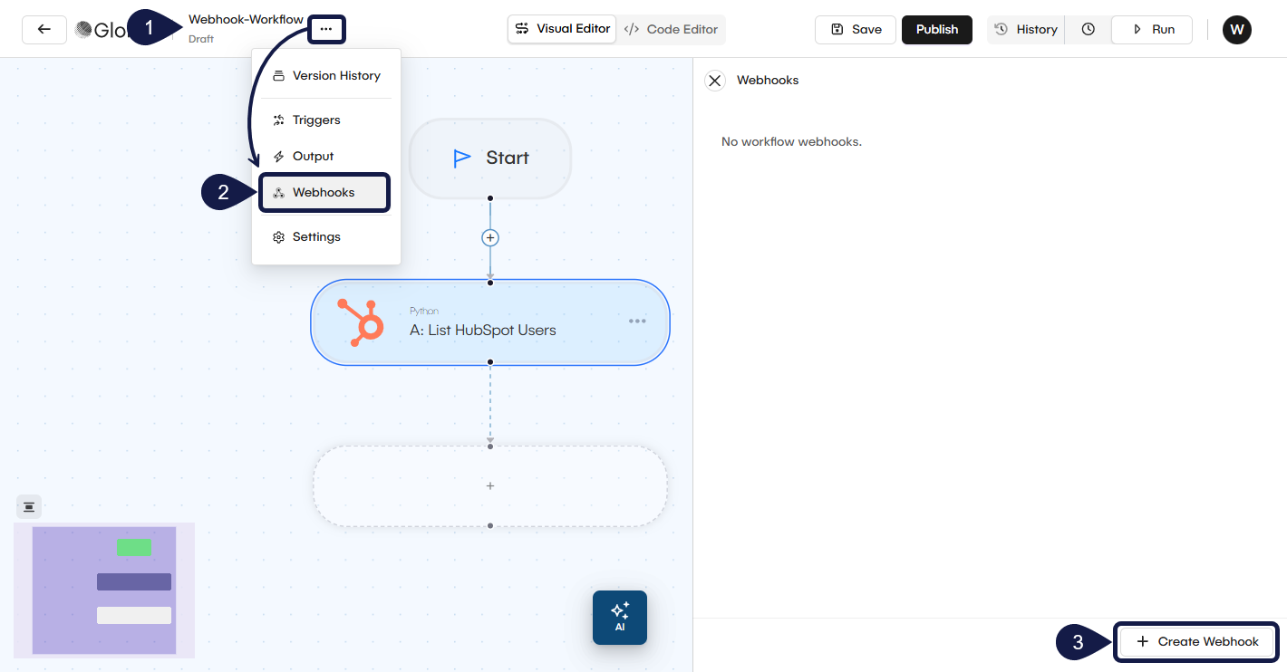 This guide explains how to add and configure a webhook trigger for a workflow in GlobalAI. A webhook trigger creates a unique URL that can receive requests from external systems to start your workflow.