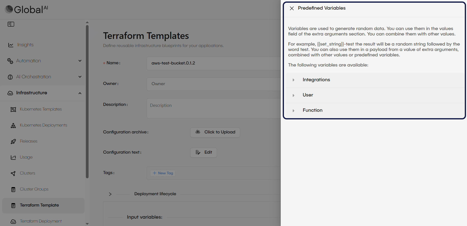Learn how predefined variables work in GlobalAI and how to use them to generate dynamic values in infrastructure configurations.